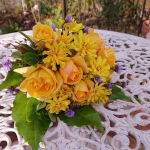 今日の花束💐 サハラ'98🌹とジニア。 ちょこっと孔雀草🎵 紫の小花ってどんな色にも合う気がします💓