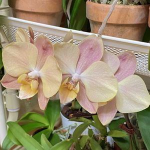 今日の満開ちゃん🤗 ①②胡蝶蘭マザーチーク💕 開きたては黄味が強くだんだんピンクっぽい色に かわいいです♬ 写真だとよく分からないけど花びらの表面がキラキラ輝いてます✨ ③④モニター胡蝶蘭ファーストラブのふぁ〜ちゃん🤭💕 今年は5輪咲きました♬ 1輪目は花びらが小さくてそりかえっててかわいくなかったからびっくりしましたが、だんだん本来のお花に近づいてきました でも小ぶりかな😅 来季は去年みたいに大きく咲かせたいなぁ