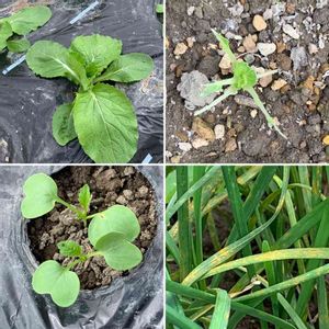 今日の畑😄 左上、ミニ白菜に追肥😊 右上、誰だー⁉️予備の白菜🥬食べたの‼️ ネット掛けずに仮植えしてたのに😅 左下、大根の間引き😊 左下、ニラの赤サビ病😱食べずにカットし、畑に置かずに持ち帰り処分😅 水やりして終了😊