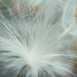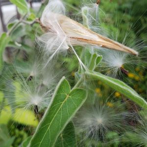 旅立ち 細長い鞘から飛び出した ブルースターの種 上部の白い綿毛が綺麗!!! フワフワしてて それなりに 絡み付いてます キョウチクトウ科 別名オキシペタラム