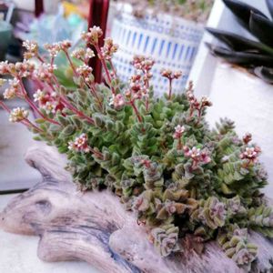久しぶりの投稿です。 ずっと雨☔です… モリモリのエルネスティにお花🌼が咲いてます🎵 ダイソーの流木風の鉢に✨ 低気圧のせいでなかなか頭痛がおさまりませんが多肉見てちょっと気分転換! 早く梅雨明けしてくださーい‼️ 😭