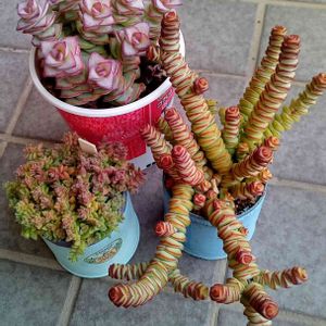赤いこ🍁②… ファイヤークラッカーは、紅葉すると一層、花びら感が増してかわいい♡セダム好きのわたしの推し👆 小さなクラッスラ を集めた鉢は、数が減り隙間が空いて火祭り挿したんですけどやっぱりおかしい寄せ植えでしょうか❓