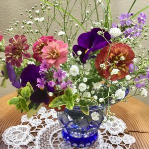 こんにちは😊〰️‼️ お暑う☀️ございま〜す ‼︎‼︎ 💦 咲き始めた 百日草や かすみ草、 そして 咲き残ってるパンジーなどで 小さなアレンジ 出来ました❣️ 添えた葉っぱ🌱は 、 ツルマサキ と カンスゲ です ❗️ まだ エアコンは 使ってませんが 、扇風機で 涼しくしています❣️