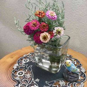 シダのような葉&スターチス&百日草のちょっとしたアレンジです⭐️ 一輪挿しは旅行先で購入した、美濃焼の一輪挿しです♫