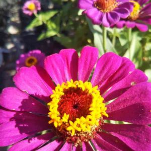 "百日草" 畑で遭遇🌿🌿 夏から秋までの 百日の長い期間咲く 一年草です🤔 黄色のリボンを 付けた芯が🌻 可愛いです🤗
