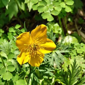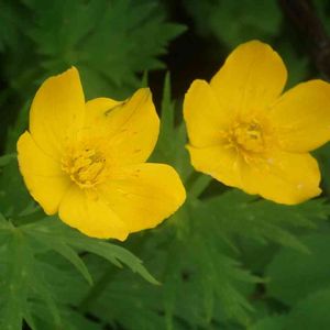 シナノキンバイ(信濃金梅) キンポウゲ科 県内(長野県)に多い花なので、この和名となった。 葉は大きく5裂しさらに裂けている。黄金色の花弁は径3.5~4.5cmで萼片が変化したもの。光沢はなく形は不揃い。 高山にしか咲かず、黄色い他の花にくらべて大きい花なので区別は簡単。