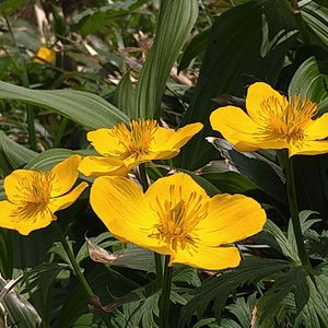 白馬五竜高山植物園 シナノキンバイ 多湿の草地に群生する 高さ 30〜70cm 茎は直立 葉は手のひら状に5裂する 花径 3.5〜4.5cm 花びらは萼片が変化したもので、かへは大変小さく雄しべより短い。 群生してお花畑になる 2021.6.24