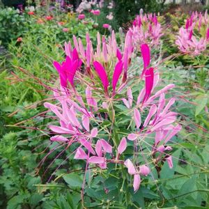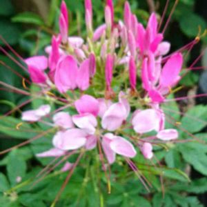 ピンククイーン クレオメ 実家の庭に夏になると咲いていた懐かしい花。 こぼれ種から同じ場所に、咲いてたのかな。 見切り品で50円でした。もう、種も出来て終わりかけだけど、連れてきました。
