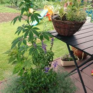 クレオメ 背が高くなりました。 私の胸辺りかな( ´﹀` ) チビの遊びの残がいが(¯―¯٥)