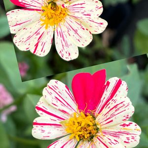 ジニア ペパーミントスティック。 咲くのを楽しみにしてたのに、花びらかじったのは誰?😅 良く見ると、お花のなかに星がいっぱい💕