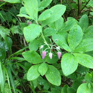 萼裏白瓔珞・釣鐘躑躅 がくうらじろようらく・つりがねつつじ ツツジ科 ヨウラクツツジ属 高さ 0.3〜1m 花期 5月〜7月 山地帯〜偽高山帯のやや湿った林内や草地に生える落葉低木。ウラジロは葉の裏面の帯白色からきている。 ウラジロヨウラクよりガク片が7〜9mmと目立って長いので。