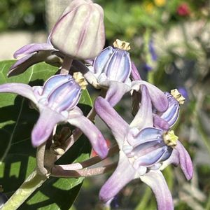 クラウンフラワー 今日の自宅にて咲くクラウンフラワ ーです。花の全体は紫の濃淡が美し く中央部分を見るとまさに「クラウ ンフラワー」ハワイ王朝最後の王で あるリリウオカラニ女王👑がこよ なく愛した花としてレイにもよく使 われるそう〜。(*´∀`)♪❣️