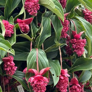 メディニラ-マグニフィカ 昨日のよへなあじさい園にて、メデ ィニラ.マグニフィカが乱舞するよう に沢山の花が開花しています。 まるで原産地のフィリピンの花園に 迷い込んだようでしたね〜。「熱帯の 宝石」と呼ばれるその花は葉や茎、 花の非常に個性的で、特にぶどうの ように垂れ下がったビビットピンク は植物に興味がない人でもつい見と れてしまう程魅力的です。(*´-`)❣️