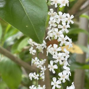 バイオリンの木の花 一昨日の自宅にて咲くバイオリンの 木の花です。バイオリンの木はフロ リダ半島、カリブ海域、ベネズエラ 等が原産地です。バイオリンの木と 呼ばれるのはこの木でバイオリンの 弓を作った事に由来すると言われて います。花は小さくて細長い花序に 数十個の小花が付き、風にゆらゆら 揺れてジャスミンに似た香りを漂よ わせます。(*´∀`)♪❣️