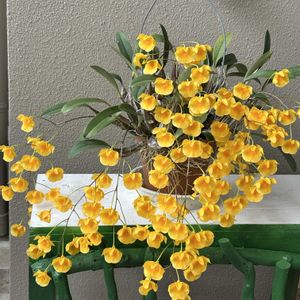 デンドロビウム-リンドレイ 今朝の自宅にて咲くリンドレイで す。インド、東南アジアに自生する デンドロの原種です。花は下垂の房 咲きで花色は明るい黄色、喉奥が濃 い黄色で愛嬌のある可愛いらしい花 ですね〜。(*´∀`)♪❣️