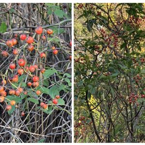 おはようございます😊 休みの昨日、遠出の早朝散歩。 1枚め、数年前にも見たネナシカズラを今年も発見。2枚め、ノイバラの実に絡むネナシカズラ。ノイバラの実より赤紫っぽく、細長い楕円形。 4枚め、これはセンニンソウの花後⁉️ 5枚めは採取したセンダンの実と、ノイバラの実。帰宅して漂白剤を薄めた液の中に。半日浸けて、今は洗って干してます。リースや色々、植物雑貨になる予定。 (2025/11/8撮影)