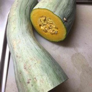 収穫後のキュアリング中の宿儺カボチャ🎃 まだ収穫後2週間にもならないけど、冷蔵庫のカボチャがなくなったので食べる事にしました。下の方は種ありますが、上の細い部分には種ありません😊