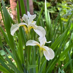 庭の一角で、白アヤメ、フリージア、セッコクが咲いています。 近いうちに、庭の草取りをしなくては!🤔