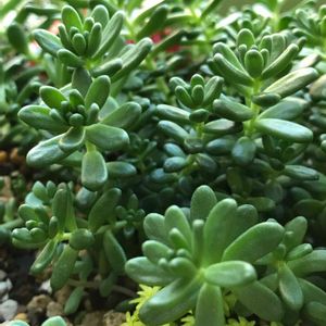 久々に登場✨ 班入りグリーンネックレスとセダムの寄せ植え💚 ブレビフォリウムに続いて 黄金丸葉万年草もお花が咲いてきました🎶 いい感じに混じって お気に入りの寄せ植えです😊💓