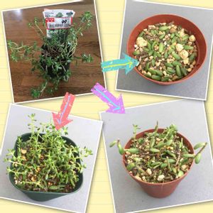 見切りで¥99になってた 伸びに伸びた白花タイトゴメ チョキンチョキン カットして植え直してみました✂️ ① チョンパした頭だけをひたすら挿す ② チョンパされた根元で 新芽や気根が出てた部分をさらに切り刻んで ③ 挿す時取り除いた葉っぱだけをばらまく どれが1番いい感じに育つかな〜🌱