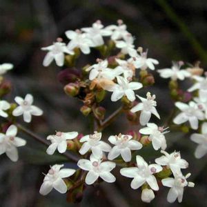 【オトコエシ】 オミナエシ科の多年草。 北海道〜九州の日当たりのよい山野にごくふつうに見られる。 高さ0.6〜1m。花期は8〜10月。 茎の上部で枝分かれをして、白い小花をたくさん付ける。 花冠は先端が5つに裂け、径4mmほど。 山口県セミナーパークにて。