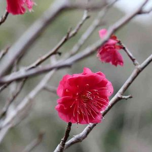 【ウメ(梅)】 中国原産、バラ科の落葉高木。 picは、濃紅色の代表的な品種である「鹿児島紅」 花の大きさは2.5cm程度の中輪の八重、色は濃紅色。 花弁には波がないので平たく見える。 しべの数も多く、色も花色に似て濃紅色。 見頃は、2月中旬~3月上旬 山口県セミナーパークにて