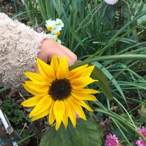 ひまわりが咲いているよ!と、娘。水仙が奥に咲いてます。こちらも季節がわからなくなるー!