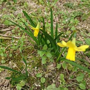 畑の近くで発見❗😆 親戚の方が植えてたのが、今年も咲いたらしいです❗🙌 黄色の水仙って良いですよね🎵 でも、なんでうつ向いてるんだろー不思議 ちなみに地面の苔も花が咲いてました~🎵拡大すれば見れるかも❗😆