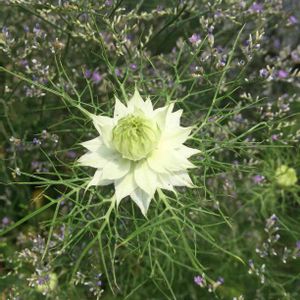 花の中に紛れて一輪だけ咲いているのを発見❣️ハウスのすみに残ったタネをパラパラしたのが育ったんですね。朝一番のうれしい発見でした。花壇に植えたニゲラは咲くまでもう少し…かな。