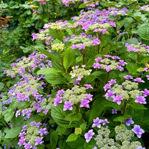 ☁️梅雨入りの今日の庭🌹薔薇や庭の作業が一段落したので☂️一雨欲しいところ😅紫陽花が沢山咲いたので💐知人にお届けします❣️ ①紫陽花ダンスパーティー達?手前は小町かも🤔 ②お届け用に切った紫陽花(マジカル、ダンパ、万華鏡、カシワバ) ③薔薇との相性良いです❣️ ④薔薇のアーチは今は篭口💜 ⑤今日の花❣️ホリホックとコモンマロウ📸暗くなってフラッシュなので色が💦