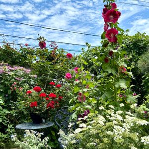 ☀️梅雨の晴れ間✨夏立ちぬ今日の庭🌸立葵の花姿に夏を感じます❣️庭の紫陽花が綺麗な季節です😍💕 ①🩵久々の青空が美しい💕🤍オルレア❤️タチアオイ🔴ゼラニウム🩷アジサイ達😍❣️ ②🌹パローレ ③紫陽花達(カシワバアジサイ、マジカルハイドランジア、巡恋歌、スイセンノウ、キャットミント、アナベル) ④🌹ローゼンホルンと青空と雲 ⑤紫陽花ひな祭り🎎同じ株なのに色が違うのは何でかなぁ〜😕