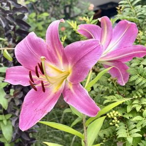🔥34℃続く今日の庭😫カサブランカが咲き出して百合の芳香☀️夏庭に耐えている💦 ①ピンク色カサブランカ ②八重カサブランカ ③プドウ藤稔🍇シャインのようなお色だけど赤実 ④赤色ベルガモット増えて欲しい ⑤ピエールドゥロンサール2番花🌹手が届かないので放置だけど😅2階から見ると結構咲いてるぞ💕