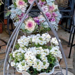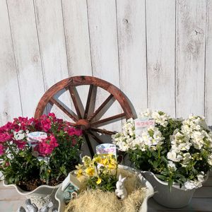 フリル咲き小輪パンジー ペルクレアも2色お迎え 色によって印象が変わりますね 💜お一人植え 🍋青みがかったレモン色は ネメシアモフモフと小さなカゴに🧺