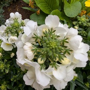 🌸お花便り 【#大輪ネメシアモフモフホワイト 】 🗓️定植2024-11/1 → 2025-4/212 (23w1d) 🗾耐寒性ゾーン8b 🧭南西 🪴6号スリット1株 ☀️5時間 🚿週3 🧴週1 白いお花の前で白いお花を撮るって最高*٩( ᐛ )و 📌③なんか狭そうにしてるよね🙊 #大輪ネメシアモフモフ #ネメシア