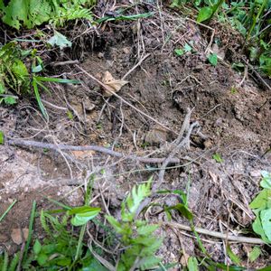 こんにちは😉午前中に池に水を引いている沢のタンクのメンテナンスする道の草刈りをしました。途中2カ所に大きな穴がありました😅2枚目の画像にナタを立てました、ナタの長さは37センチですがわかりにくいかも🤔イノシシが掘り起こしたのは好物のヤマイモです。