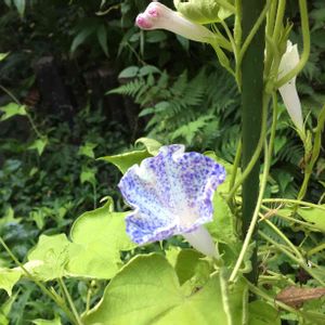 台風前にやっと咲いたうちの朝顔 吹掛絞と呼ばれる模様で、大好きですが、この模様のは、結実がわるいです(>_<) 獅子系統で多分獅子抜けです。 花も小さいですー(笑)