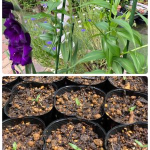 グロリオサの花芽が出てきました となりに名前の似てるグラジオラス😅 五色トウガラシの芽が出たのでポットに移し替え