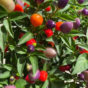 ゴシキトウガラシ (五色唐辛子) ナス科の一年草ですが、原産地の熱帯アメリカでは多年草です。 唐辛子🌶の一種であり観賞用に改良品種されたもので、色が段々と変化していきます。 最初は紫➠クリーム色➠黄色➠オレンジ➠赤です。 観賞用ですから食べられません。しかし観賞用とは言え十分な辛みがあるので、果実の取り扱いには注意⚠️を要します。果実を触った後に目👀を擦ったりすると、大変な事に・・・(*º ロ º *)!! 果実を付け始めると、株は成長をしなくなります。