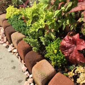 朝撮り写真。 地植えのセダムさんたち☀️🌱 もりもりのツヤツヤで、鉢植えの子たちよりも元気いっぱい💦 真ん中にいる黄緑の子はレタスではなく、 ライム系のヒューケラです😅