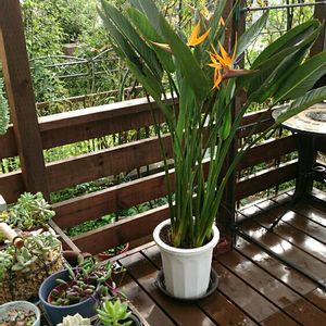 台風避難のストレリチア 5月頭に鉢大きくしたけど もう根っこで鉢が膨れてる…