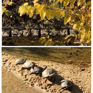 おはようございます😃 自宅横を流れる小さな川、森前川です。 岸辺に生える灌木も黄葉して、落葉し始めました。 愛知県も昔は養蚕が盛んだったせいか、時々、桑の木の自生が見られます。 大きな葉っぱが綺麗に黄葉しています。 狭い流れにできた、小さな中洲。 亀が一列に並んで日向ぼっこをしています。 この川にもたくさんのミドリガメが生息しています。 私が子供の頃にはイシガメが珍しくて、見つけると大切に飼ったものです。 そのうちに、お祭りの夜店で、小さなミドリガメが売られるようになりました。 可愛くて、買って欲しかったものです。 今ではイシガメは見られず、大きく育ったミドリガメばかり繁殖しています。 理科の授業で、亀は冬眠すると習いました。 この亀は一年中見られます。 暖かで、氷も張らない川なので、冬眠も必要ないのかもしれません。🤔