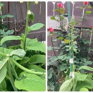 連投📮失礼します🙏 見てください😭😭😭 昨日ふと見たら…やっとここまで育ってくれたジキタリスが…ポキッと折れているではありませんか😱😵💫💦 わー!どうしよう💦💦 無駄な抵抗なのは分かっていますが、いてもたってもいられなくて、テープで巻いて、棒に固定しました😢 太く、若くて水分たっぷりのみずみずしい茎だから…。。きっとダメですよね😔 でも願うような気持ちで…🙏