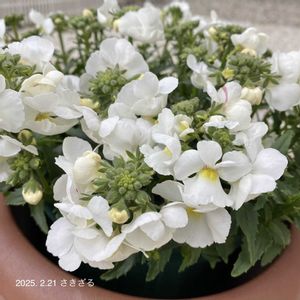 🌸お花便り 【#大輪ネメシアモフモフホワイト 】 🗓️定植2024-11/1 → 2025-2/21 (16w1d) 🗾耐寒性ゾーン8b 🧭南西 🪴6号スリット1株 ☀️5時間 🚿様子を見てチョロチョロ 🧴週1 世間をこそっと騒がせてる(?)チーク入りのモフホワイト🌱現在2お目目を確認しました👀 📌②蕾も色っぽい子居るよね🧐 📌②③のpicぼやけてるけれどまだ老眼じゃないよ😆チークの撮影が激むずだった💦 #大輪ネメシアモフモフ #ネメシア