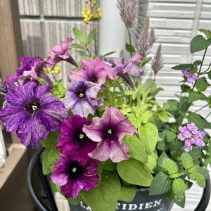 【夏の寄せ植え】 ・ペチュニアシェーク ・ランタナ ・プチロータスジョーイ ・コウシュンカズラ ペチュニアシェークのくすみカラーがめちゃめちゃ可愛い🌸❤︎