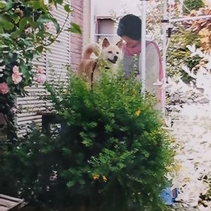 10年前の庭の様子 2013/5/15のpicです。 ボケボケでスミマセン💦 朝の散歩後、ウッドデッキに置いた テーブルの上に愛🐶を乗せてブラッシング してるところを、お隣さんが撮って 下さったものです。 左のバラ🌹はアンジェラ。 小さな出窓の周りに這わそうとしたけど 伸びに伸びて手に負えなくなり、後に 抜くことに。🥲 中央の緑はエニシダ(ヒメエニシダ)。 葉ばかり茂りチラホラとしか咲かないので 後に移植したら枯れました。🥲 右端に写る白いものは5/8に投稿した イヌコリヤナギ 白露錦。 その上に写るオレンジっぽい葉は スモークツリー。 この子たちだけ今も健在です。😅 🏷ワンワン祭り 参加させて下さい。🥰