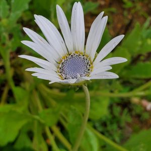 行きつけのパン屋さんのお庭から😅 アークトチスかなぁ? ガーベラやガザニアに似た花👏 白い花弁に紫色の花芯が印象的。 初夏の花壇に合うね👏