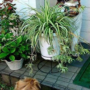 オリズルランの奥のセントバーナードに Σ(゜Д゜)ビックリして、 足を止めた愛犬🐶