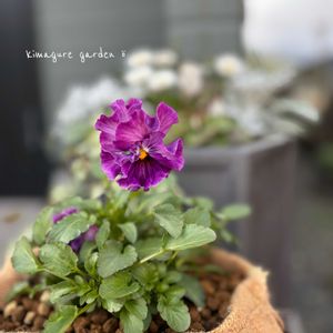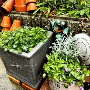こんにちは😊 町のお花屋さんで葉牡丹が100円になっていたので連れ帰り 寄せ植えをちょい直ししてみました 葉牡丹とお散歩ちゃん♡かわいい♡ 黒の葉牡丹 光子さん 黒プリムラと多分 紫のシエルブリエと black&purpleミニガーデン作成◼️🟣 プリムラはナイロン袋で霜よけしてるので、もう少し寒さに慣れてから解放予定