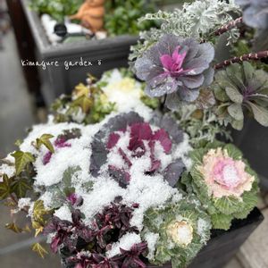 こんにちは🥶 さすが最強寒波*🥶💨* 寒い🥶 今しか見られない雪景色⛄️ 花壇も雪ちょい盛り 久しぶりのお散歩ちゃん 葉牡丹と📱_(-ω•_パシャ