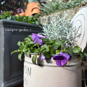 こんにちは😊 寒空の下 ブリキ鉢に寄せ植えたビオラちゃん 少し咲いてた